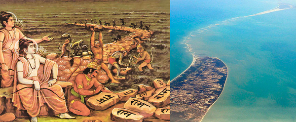 2.రామసేతు: రామాయణం చదివారా ? కనీసం సినిమా అయినా చూసారా ? చూసి ఉంటే మీకు రామసేతు వంతెన గురించి తెలిసే ఉంటుంది.అదేనండి .లంకను చేరుకోవడానికి వానర సైన్యం సముద్రంలో వంతెన కడుతుంది కదా.ఆ బ్రిడ్జ్ పేరే రామసేతు.ప్రస్తుతానికైతే ఈ బ్రిడ్జ్ 50 కిలిమీటర్ల విస్తీరణంలో తమిళనాడు.శ్రీలంక మధ్య ఉంది.దీన్నే ఆడమ్స్ బ్రిడ్జ్ అని కూడా అంటున్నారు.యుగాల ముందు కట్టినది కాబట్టి ఈ వంతెన చాలావరకు ధ్వంసం అయ్యిందని చరిత్రకారులు అంటారు.