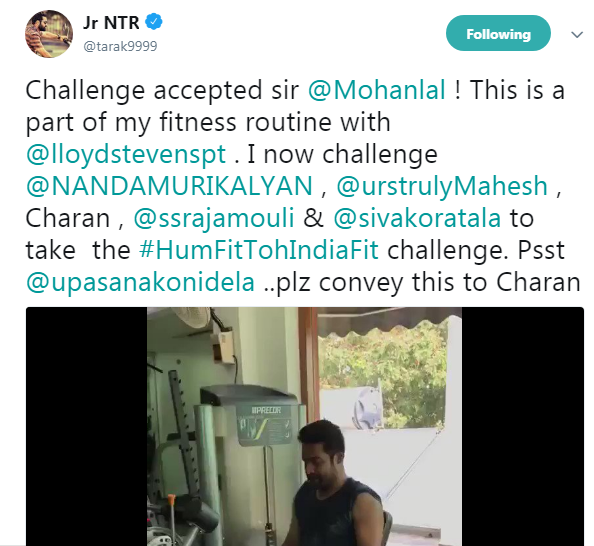 ఇది అలా అలా పాకుతూ యంగ్ టైగర్ ఎన్టీఆర్ వద్దకు చేరింది.‘జనతా గ్యారేజ్’ సినిమాలో ముఖ్య పాత్ర పోషించిన మలయాళం సూపర్ స్టార్ మోహన్లాల్.తారక్, సూర్య, పృథ్వీరాజ్లకు ఈ ఫిట్నెస్ ఛాలెంజ్ను విసిరారు.అయితే ఈ ఛాలెంజ్ను స్వీకరించిన ఎన్టీఆర్.తాను జిమ్లో కసరత్తులు చేస్తున్న వీడియోను ట్విట్టర్లో పెట్టారు.ఆయన కూడా కొంత మందికి ఈ ఛాలెంజ్ను విసిరారు.