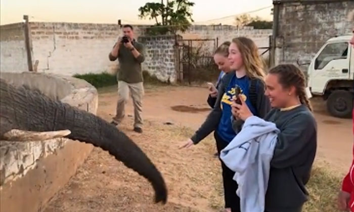 ఇంతలో ఒక యువతి ఏనుగుతో ఫోటో తీసుకుందాం అని దాని దగ్గరకు వెళ్లింది.దాన్ని ఫోటోతీయడానికి తెగ ప్రయత్నం చేసింది.ఆ యువతీ తనని ఏదో చేస్తుందని భావించిన ఏనుగు కోపంతో తన తొండంతో ఆ యువతీని కొట్టింది.ఏనుగు తొండం దెబ్బకు ఆ యువతి చేతిలోని ఫోన్ కాస్త ఎగిరి కిందపడింది.