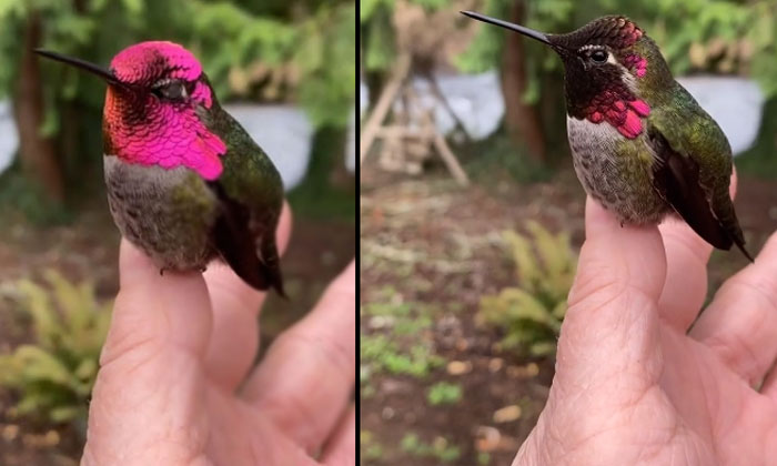 వైరల్ అవుతున్న వీడియోలో ఒక హమ్మింగ్ బర్డ్ ఒక వ్యక్తి చేతి బొటనవేలు పై కూర్చుని ఉండటం చూడొచ్చు.
